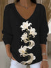 Women's Black White Lily Print V - Neck Top