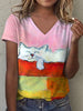 Women's Oil Painting Art Cat Print V-Neck T-Shirt